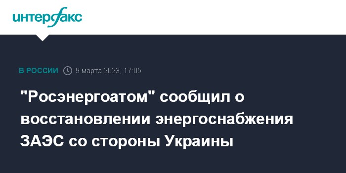 Москва. 9 марта. INTERFAX.RU - Запорожская АЭС (ЗАЭС) в Энергодаре вновь начала получать электроэнергию на собственные потребности со стороны Украины после ночного отключения, сообщил "Интерфаксу" советник главы концерна "Росэнергоатом" Ренат Карчаа.