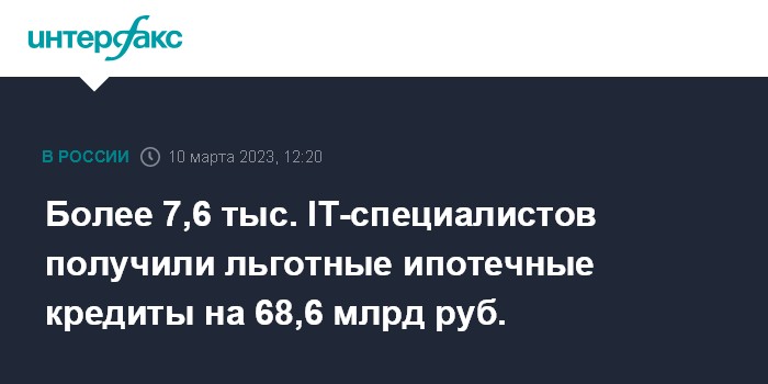 Москва. 10 марта. INTERFAX.RU - Более 7,6 тыс. сотрудников российских ИТ-компаний получили льготные ипотечные кредиты на сумму 68,6 млрд рублей с момента начала реализации соответствующей программы, говорится в сообщении Минцифры РФ.