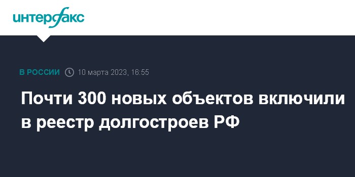Москва. 10 марта. INTERFAX.RU - Почти 300 новых объектов включено в федеральный реестр незавершенных объектов капитального строительства, сообщили в пресс-службе Минстроя РФ в пятницу.