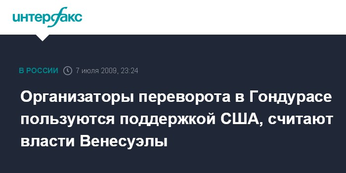 Каракас. 7 июля. ИНТЕРФАКС - Представители правительства Венесуэлы заявили во вторник, что организаторы переворота в Гондурасе удержались у власти, так как они заручились поддержкой со стороны США, сообщает агентство ЭФЭ.