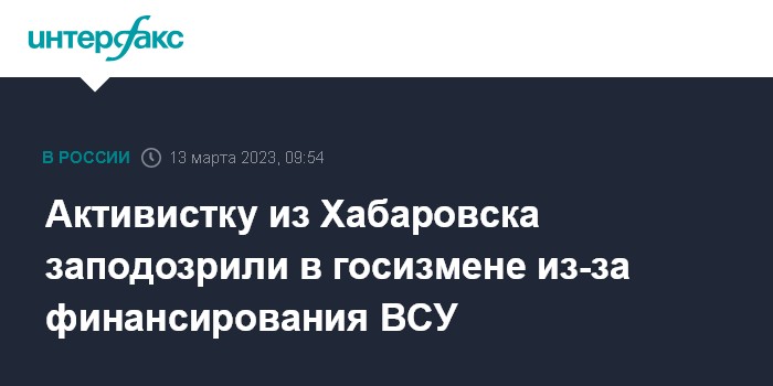 Москва. 13 марта. INTERFAX.RU - Активистка хабаровского движения "ЯМЫФУРГAЛ" подозревается в финансировании Вооруженных сил Украины, возбуждено дело о государственной измене, сообщили в Центре общественных связей (ЦОС) ФСБ РФ