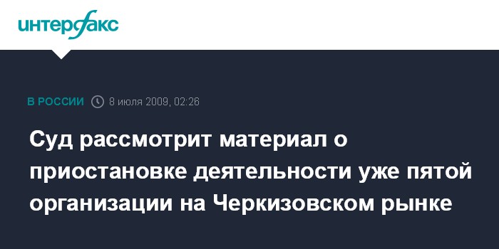 Москва. 8 июля. ИНТЕРФАКС - Измайловский суд Москвы в среду рассмотрит пятый материал о приостановке деятельности на 90 суток организации, расположенной на территории Черкизовского рынка.
