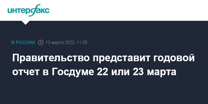 "Дата ежегодного отчета правительства в Госдуме не определена. Обсуждаются варианты 22 или 23 марта. Консультации с Госдумой по этому вопросу продолжаются ", - сообщили "Интерфаксу" в пресс-службе правительства.