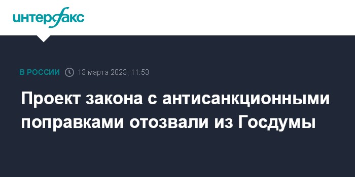 Москва. 13 марта. INTERFAX.RU - Законопроект с антисанкционными поправками снят с рассмотрения Госдумой в связи с отзывом автором, председателем думского комитета по госстроительству и законодательству Павлом Крашенинниковым.