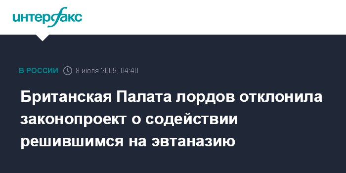 Лондон. 8 июля. ИНТЕРФАКС - Верхняя палата британского парламента отвергла законопроект, предлагающий легализовать помощь неизлечимо больным людям в выезде за границу в целях "совершения самоубийства", сообщает в среду Би-би-си.