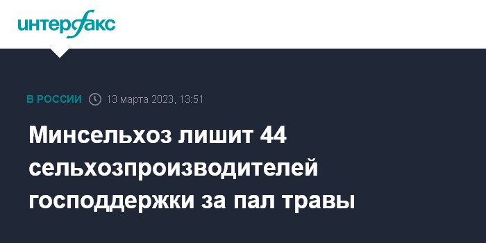 Москва. 13 марта. INTERFAX.RU - Минсельхоз в 2023 году лишит 44 сельхозпроизводителей господдержки за несанкционированный пал пожнивных остатков на полях в прошлом году, сообщил директор департамента растениеводства Роман Некрасов на совещании в Совете Федерации по готовности регионов к пожароопасному сезону.
