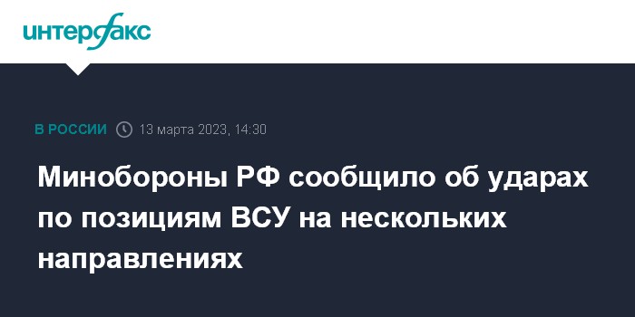 Москва. 13 марта. INTERFAX.RU - Российские военные наносят удары по позициям армии Украины на красно-лиманском, южно-донецком, запорожском и херсонском направлениях, заявил официальный представитель Минобороны РФ Игорь Конашенков.