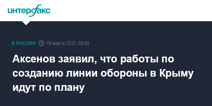 "Работы идут по плану. На строительстве занято достаточно большое количество людей и техники, оно ведется с использованием передового опыта в данной сфере. Понятно, что раскрывать подробности мы сейчас не можем. Скажу только, что поручение президента будет выполнено и крымчане могут быть уверены: полуостров под надежной защитой", - заявил Аксенов, отвечая на вопрос издания, сколько времени потребуется на создание в регионе оборонительных сооружений.