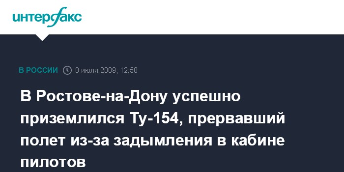 Москва. 8 июля. INTERFAX.RU - Самолет Ту-154, на борту которого произошло задымление кабины пилотов в полете, благополучно приземлился в аэропорту вылета Ростове-на-Дону. Как сообщили агентству "Интерфакс-Юг" во вторник в главном управлении МЧС РФ по Ростовской области, в настоящее время пассажиры вышли из салона самолета, жертв и пострадавших нет. Собеседник агентства уточнил, что задымление прекратилось, когда лайнер кружил на городом, вырабатывая топливо. Однако командир корабля принял решение совершить аварийную посадку.