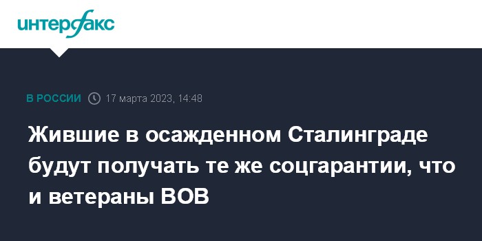 Москва. 17 марта. INTERFAX.RU - Граждане, награжденные знаком "Житель осажденного Сталинграда", смогут получать те же привилегии и социальные гарантии, что и ветераны Великой Отечественной войны, сообщил премьер-министр РФ Михаил Мишустин.