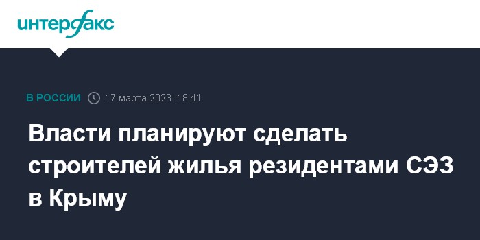 Москва. 17 марта. INTERFAX.RU - Строители жилья могут стать резидентами свободной экономической зоны (СЭЗ) в Крыму, заявил на совещании у президента вице-премьер Марат Хуснуллин.