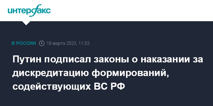 Москва. 18 марта. INTERFAX.RU - Президент РФ Владимир Путин подписал законы об уголовной и административной ответственности за дискредитацию добровольческих формирований и организаций, содействующих Вооруженным силам РФ, и за фейки о них.