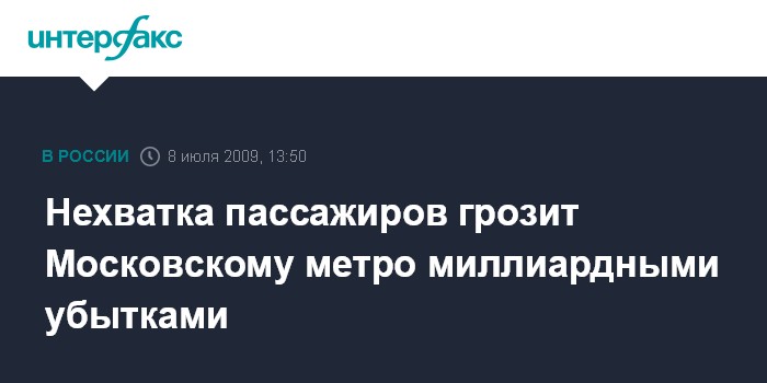 Москва. 8 июля. INTERFAX.RU - Московский метрополитен недобирает средств, сообщил сегодня на пресс-конференции начальник метрополитена Дмитрий Гаев. По его словам, из-за тяжелой финансово-экономической ситуации услугами московского метро перестали пользоваться 600-700 тыс. пассажиров в день. "Таким образом, мы не добираем финансовые ресурсы для выполнения важных программ по развитию московского метрополитена. И по году оценочно потери от уменьшения количества пассажиров у нас составляют 3 млрд руб.", - сказал Гаев.Он пояснил, что из-за этого инвестиционная программа по развитию метрополитена была сокращена на 30%.