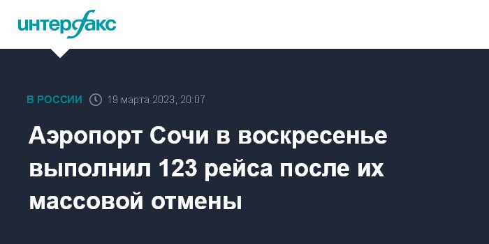 Москва. 19 марта. INTERFAX.RU - Аэропорт Сочи выполнил 123 рейса после их массовой отмены из-за сильного тумана в городе в воскресенье, сообщили "Интерфаксу" в пресс-службе сочинского аэропорта.