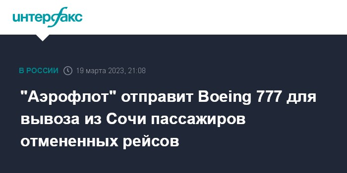 Москва. 19 марта. INTERFAX.RU - "Аэрофлот" в понедельник вывезет из Сочи пассажиров отмененных из-за сложных метеоусловий рейсов на самолете повышенной вместимости Boeing 777, сообщили в авиакомпании.