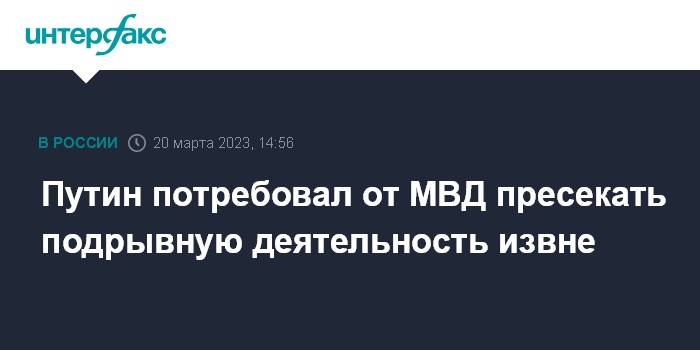 Москва. 20 марта. INTERFAX.RU - Президент Владимир Путин потребовал от МВД пресекать любые попытки противников России и их агентуры раскачать общество изнутри. Он заявил об этом на итоговой коллегии ведомства.