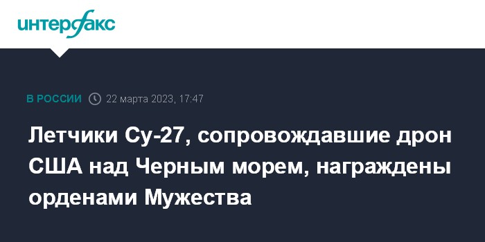 "Орденами Мужества награждены летчики самолетов Су-27, предотвратившие нарушение американским беспилотным летательным аппаратом MQ-9 границ района временного режима использования воздушного пространства, установленного в целях проведения специальной военной операции", - говорится в сообщении Минобороны РФ.