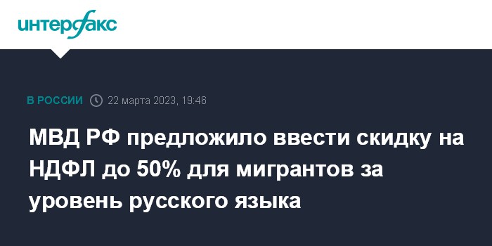 Москва. 22 марта. INTERFAX.RU - В МВД России предлагают ввести скидки на НДФЛ для трудовых мигрантов в зависимости от их уровня владения русским языком, сообщила начальник Главного управления по вопросам миграции МВД России Валентина Казакова.