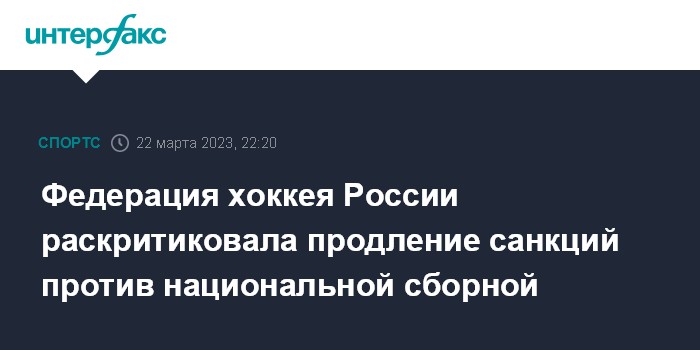 Москва. 22 марта. INTERFAX.RU - Решение Международной федерации хоккея (ИИХФ) продлить санкции в отношении сборной РФ не идет на пользу мировому хоккею, заявили в Федерации хоккея России (ФХР) в среду.