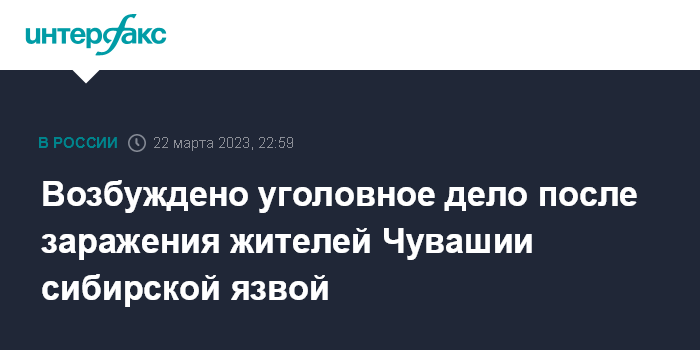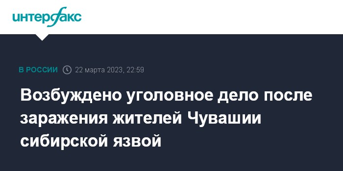 Москва. 22 марта. INTERFAX.RU - Следователи возбудили уголовное дело по факту заражения троих человек сибирской язвой в Чувашии, сообщается в среду на сайте регионального СУ СКР.