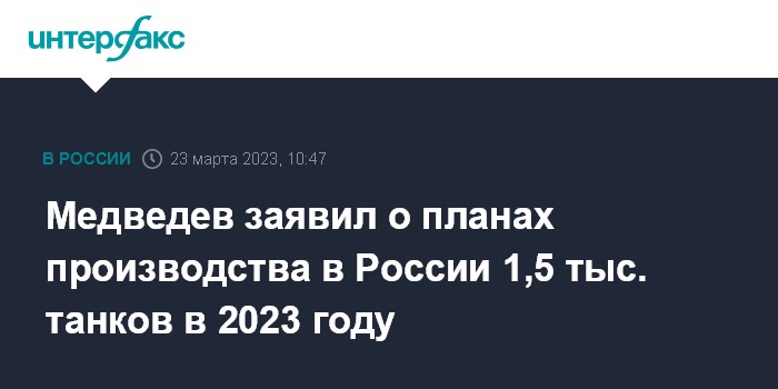 Москва. 23 марта. INTERFAX.RU - Российский ВПК в текущем году произведет 1500 танков, заявил зампред Совбеза РФ Дмитрий Медведев.