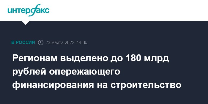 "В текущей ситуации нашли возможность применять такой механизм (опережающего финансирования - ИФ) и для строительства региональных объектов. И уже с мая российские субъекты будут получать соответствующие средства. До 180 млрд рублей", - сказал он.
