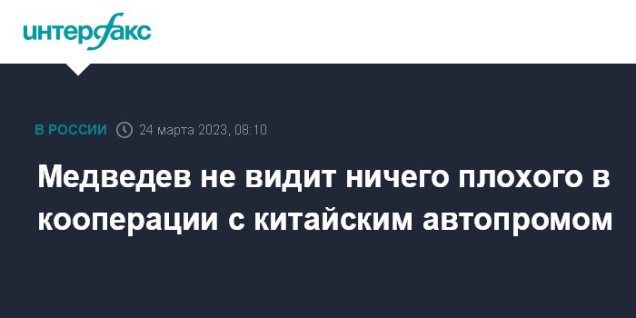 Москва. 24 марта. INTERFAX.RU - Зампред Совбеза РФ Дмитрий Медведев заявил, что не видит ничего плохого в кооперации с Китаем в автомобилестроении.