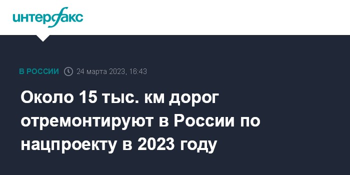 Москва. 24 марта. INTERFAX.RU - Около 15 тыс. км дорог отремонтируют в России по национальному проекту "Безопасные и качественные дороги" в 2023 году, сообщается на сайте правительства РФ.