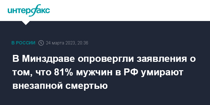 Москва. 24 марта. INTERFAX.RU - В Минздраве России опровергли данные профессора Олега Аполихина о том, что в России 81% мужчин умирают внезапной смертью.