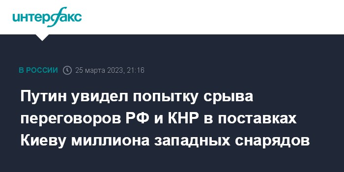 "В этот же день, когда председатель Си Цзиньпин рассказывал, показывал и доказывал положительные стороны китайского плана урегулирования (конфликта - ИФ) на Украине мирными средствами, мы узнали о поставках миллиона снарядов на Украину со стороны западных стран", - сказал Путин в интервью журналисту Павлу Зарубину для программы "Москва. Кремль. Путин", вышедшей в субботу в эфире "России-24" (ВГТРК).