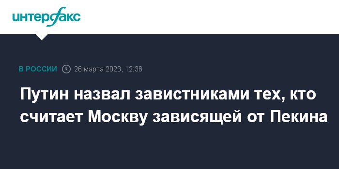 Москва. 26 марта. INTERFAX.RU - Тему растущей зависимости России от Китая развивают завистники таких отношений, считает президент РФ Владимир Путин.