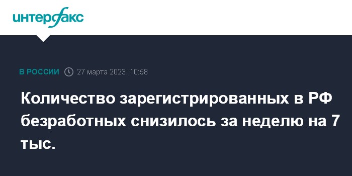 Москва. 27 марта. INTERFAX.RU - Число зарегистрированных в центрах занятости безработных в РФ за неделю снизилось еще на 7 тыс. человек, уровень регистрируемой безработицы составил 0,7 %, сообщила вице-премьер Татьяна Голикова по итогам заседания межведомственной рабочей группы по восстановлению рынка труда.