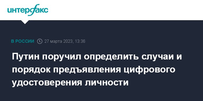 Москва. 27 марта. INTERFAX.RU - Президент РФ поручил к 1 мая определить случаи и порядок предъявления цифрового удостоверения личности вместо обычного паспорта, сообщает сайт Кремля.