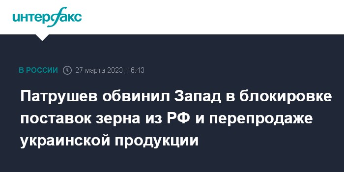 Москва. 27 марта. INTERFAX.RU - Секретарь Совета безопасности РФ Николай Патрушев заявил, что Запад блокирует экспорт российского зерна и удобрений, перепродает украинскую сельхозпродукцию.