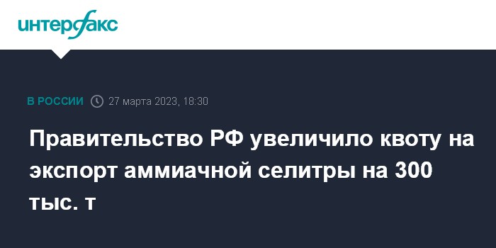 Квота на экспорт аммиачной селитры первоначально составляла 225 тыс. тонн в период с 1 января по 31 марта и 828,5 тыс. тонн - с 1 апреля по 31 мая 2023 года. В конце января она была увеличена на 375 тыс. тонн.