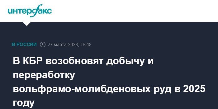 Москва. 27 марта. INTERFAX.RU - В Кабардино-Балкарии планируют завершить строительство производственных объектов, начать добычу и переработку вольфрамо-молибденовых руд Тырныаузского месторождения в 2025 году, сообщили "Интерфаксу" в Минпроме КБР.