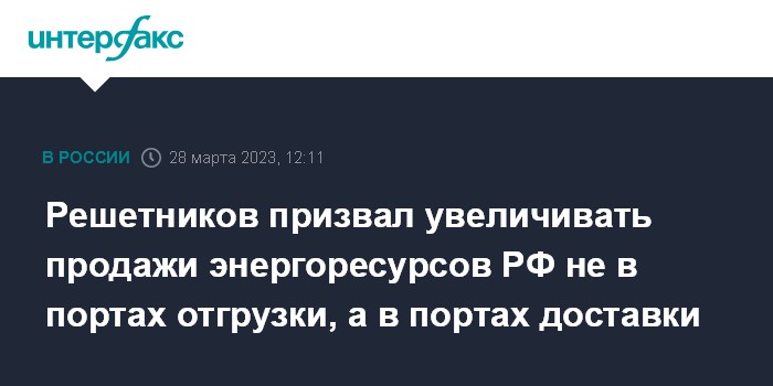 Москва. 28 марта. INTERFAX.RU - России необходимо увеличивать продажи энергоресурсов не в портах отгрузки, а в портах доставки, считает глава Минэкономразвития Максим Решетников.
