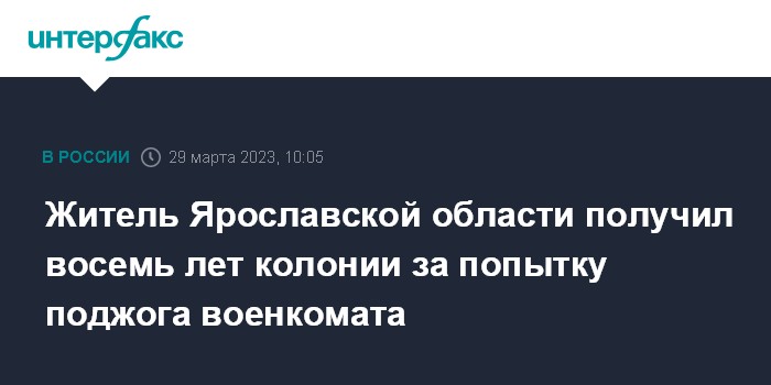 Москва. 29 марта. INTERFAX.RU - Военный суд приговорил к восьми годам колонии строгого режима жителя Ярославской области, признанного виновным в попытке поджога военкомата, сообщает в среду ФСБ РФ.