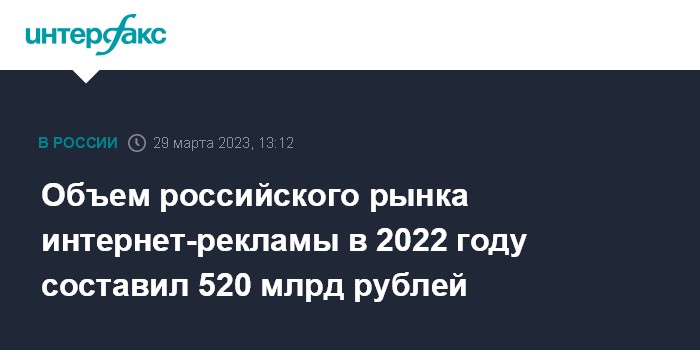 Москва. 29 марта. INTERFAX.RU - Объем российского рынка интернет-рекламы по итогам 2022 года достиг 520 млрд рублей, говорится в сообщении Ассоциации развития интерактивной рекламы (АРИР).