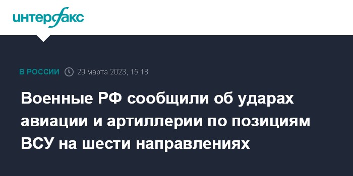 Москва. 29 марта. INTERFAX.RU - Российские военные заявили об ударах авиации и артиллерии по позициям армии Украины на шести направлениях.