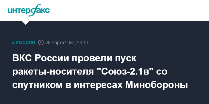 "В среду, 29 марта, в 22 часа 57 минут с государственного испытательного космодрома Министерства обороны Российской Федерации (космодром Плесецк) в Архангельской области боевыми расчетами космических войск ВКС проведен пуск ракеты-носителя легкого класса "Союз-2.1в" с космическим аппаратом в интересах Минобороны России", - отметили в военном ведомстве.