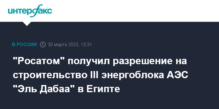 Москва. 30 марта. INTERFAX.RU - "Росатом" получил разрешение на строительство третьего энергоблока АЭС "Эль Дабаа" в Египте, сообщило корпоративное издание "Страна Росатом".