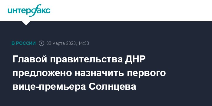 Москва. 30 марта. INTERFAX.RU - Врио главы Донецкой народной республики Денис Пушилин внес на рассмотрение Народного совета ДНР кандидатуру первого вице-премьера Евгения Солнцева на пост главы правительства республики, говорится в заявлении Пушилина, которое распространила его пресс-служба.