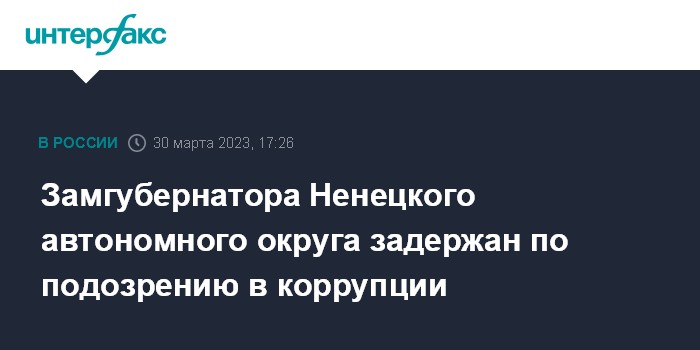 Москва. 30 марта. INTERFAX.RU - Заместитель губернатора администрации Ненецкого автономного округа задержан по подозрению в получении взятки в особо крупном размере, сообщает в четверг телеграм-канал Следственного комитета РФ (СКР).