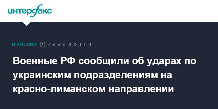 Москва. 2 апреля. INTERFAX.RU - Российская группировка войск "Центр" нанесла удары по подразделениям вооруженных сил Украины (ВСУ) на красно-лиманском направлении, сообщил в воскресенье начальник пресс-центра группировки Александр Савчук.