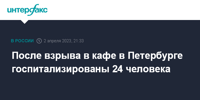 Москва. 2 апреля. INTERFAX.RU - В Санкт-Петербурге в результате взрыва в кафе один человек погиб, 25 пострадали, 24 госпитализированы, сообщили в пресс-службе Минздрава России.