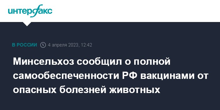 Москва. 4 апреля. INTERFAX.RU - Россия на 100% обеспечена собственными вакцинами от особо опасных болезней животных, заявил на итоговой коллегии Россельхознадзора министр сельского хозяйства Дмитрий Патрушев.