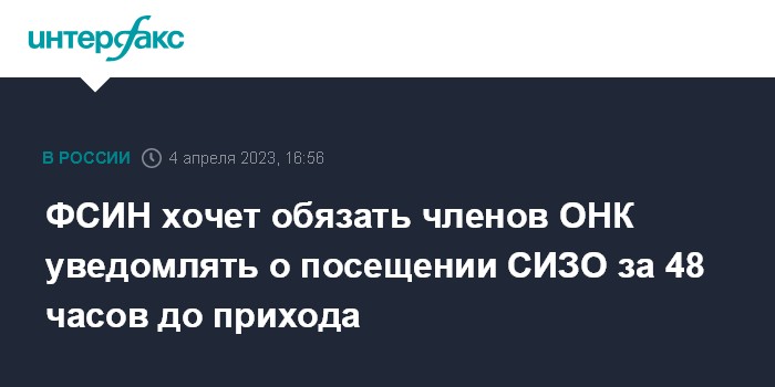 Москва. 4 апреля. INTERFAX.RU - Федеральная служба исполнения наказаний намерена обязать членов Общественных наблюдательных комиссий уведомлять учреждения ФСИН о планируемом визите за 48 часов до прихода. Проект соответствующего приказа ФСИН размещен на портале проектов нормативных правовых актов.