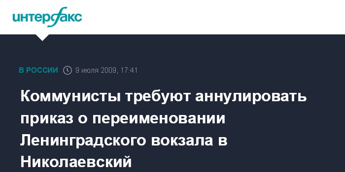 Москва. 9 июля. INTERFAX.RU - В руководстве КПРФ считают "идеологической провокацией" решение руководства РЖД о переименовании Ленинградского вокзала в Москве в Николаевский. Как заявил "Интерфаксу" в четверг первый зампред ЦК КПРФ, вице-спикер Госдумы Иван Мельников, российские коммунисты немедленно потребуют аннулирование этого приказа.