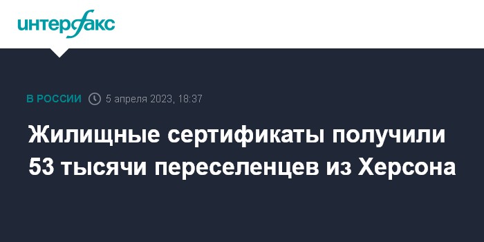 Москва. 5 апреля. INTERFAX.RU - Вице-премьер Марат Хуснуллин заявил, что жилищные сертификаты получили 53 тысячи из 68 тысяч переселенцев из Херсона. Он сказал это на заседании Совета безопасности России.